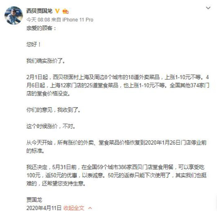 4月份,西贝因部分门店的菜品价格上涨1-10元收到消费者投诉。随后,贾国龙在其微博道歉,宣布所有涨价的菜品价格恢复到门店停业前的标准。