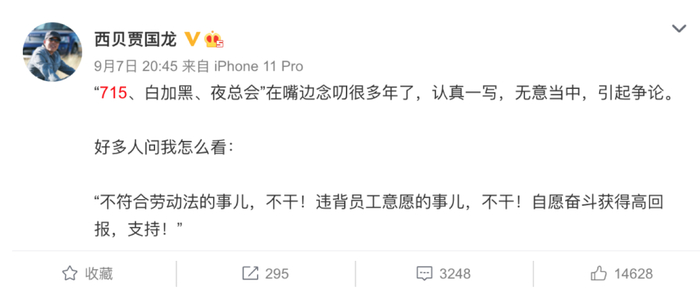 9月份,贾国龙公开表示,西贝是“715、白加黑、夜总会”(每周工作7天、每天15个小时,白天加晚上,夜里总开会)。舆论一时哗然。