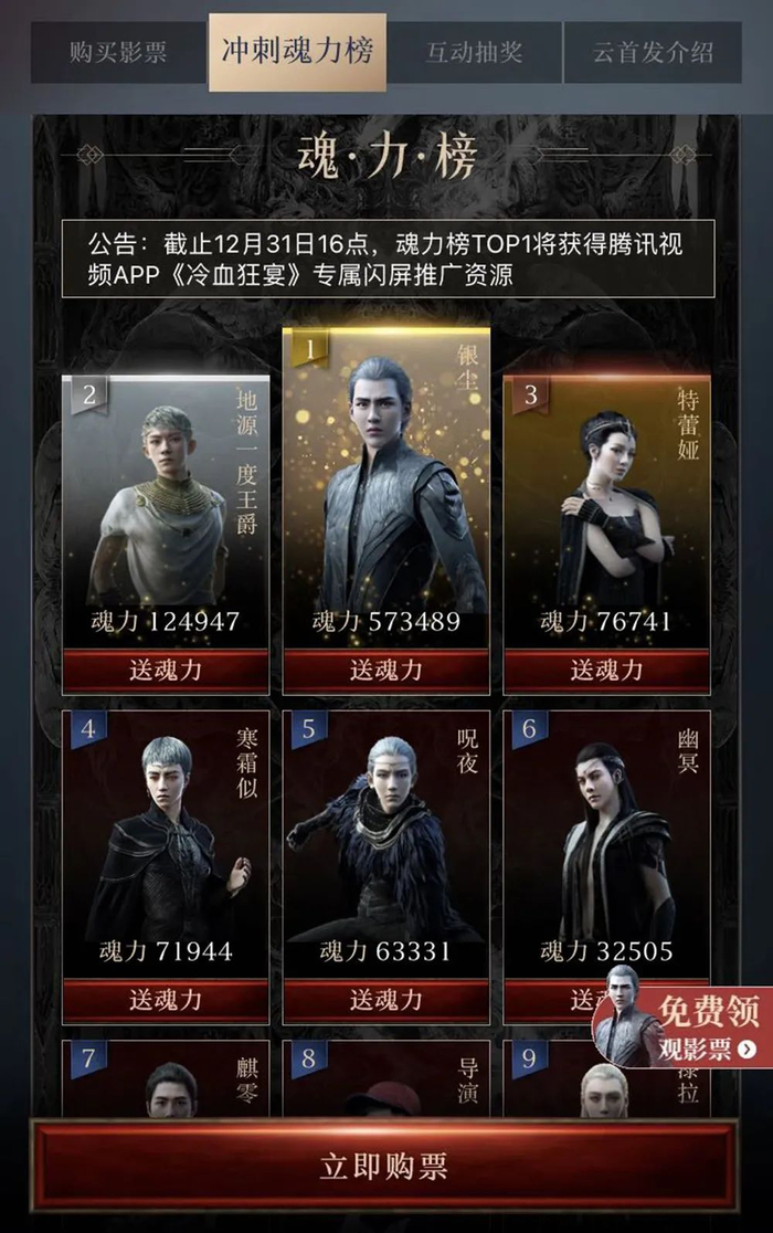 一张电影票值20魂力,这魂力榜太冷清。