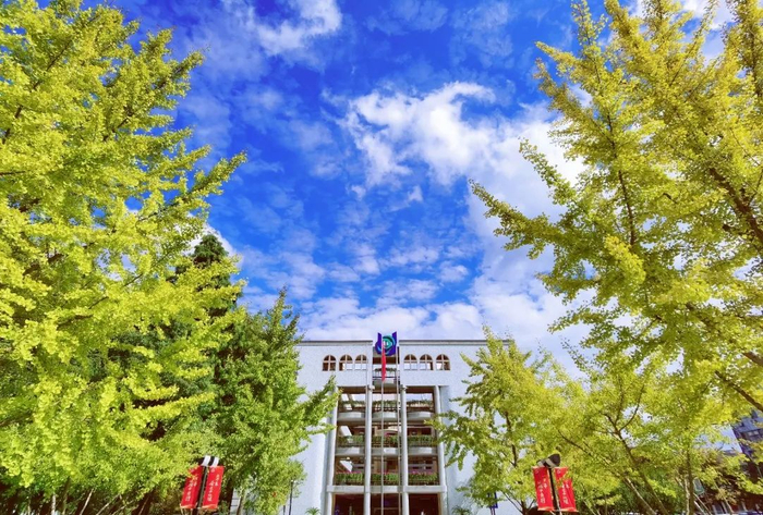 蓝天白云下,见证时光变迁的绿瓦大楼与银杏交相辉映,别有一番风情,共同构成一幅主题为“秋”的画卷。