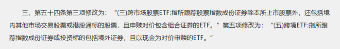对投资深沪港三地市场的跨市场股票ETF修订,仅出现在深交所的《细则》中。分别为: