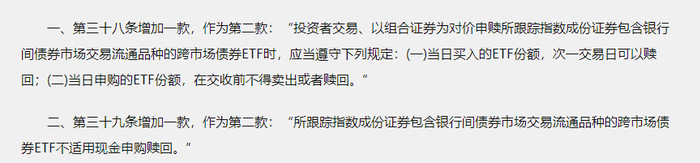 一是第三十八条增加一款:“投资者交易、以组合证券为对价申赎所跟踪指数成份证券包含银行间债券市场交易流通品种的跨市场债券ETF时,应当遵守下列规定:(一)当日买入的ETF份额,次一交易日可以赎回;(二)当日申购的ETF份额,在交收前不得卖出或者赎回。”