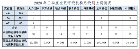 三季度,共有136家发行人更换评级机构,其中17家发行人的新承做评级机构所给级别高于原级别,占比12.50%,同比提高1.29个百分点。在变更评级机构后级别上调的发行人中,大公国际上调家数最多,有13家,占其承做更换评级机构发行人家数的40.63%,中证鹏元和远东资信分别有3家和1家。