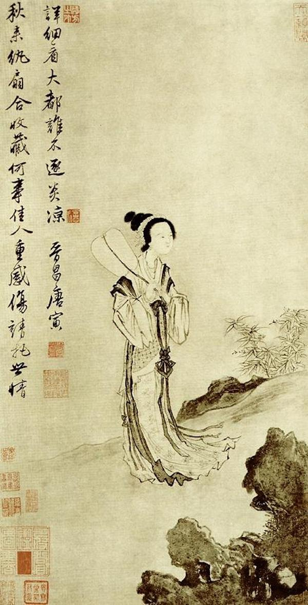 唐寅以秋扇比喻美人迟暮被抛弃的命运,同时感叹世态炎凉,也是表达他自己内心的一种感受。同时在他的《浔阳送别图》、《落花诗册》中也表达了相似的情绪。