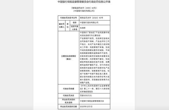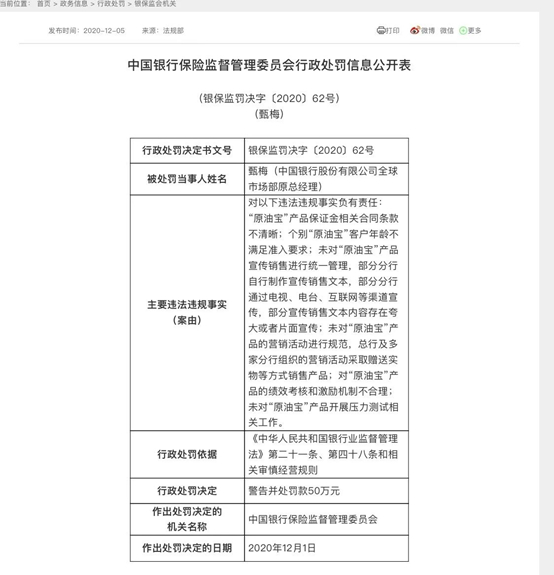 12月5日,银保监会官网消息显示,近期,中国银保监会就中国银行“原油宝”产品风险事件依法开展调查工作,对所涉违法违规行为作出行政处罚决定,并采取相应的监管措施。