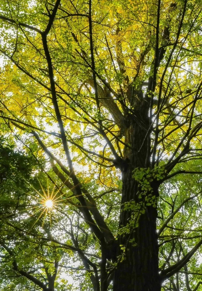 靠河近的一棵树干粗壮,3个成人合抱不来,远远望去,冠如华盖,枝若虬龙。而靠里的一棵冠幅较小,枝头也已布满金叶。