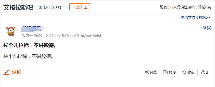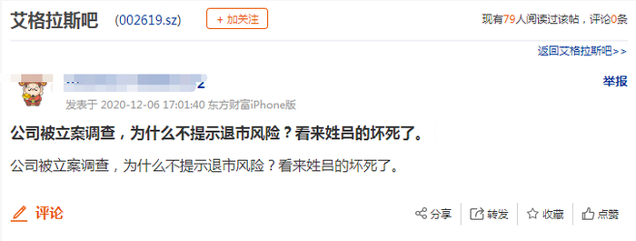 针对公司遭立案调查一事,股吧有网友展开热烈讨论。有网友表示,“不讲股德。”,也有投资者留言称,“公司被立案调查,为什么不提示退市风险?看来姓吕的坏死了。”