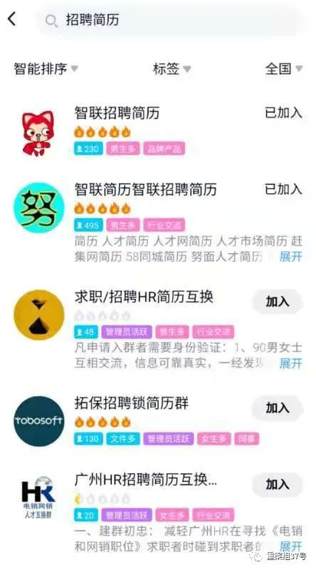 ▲使用QQ群搜索功能输入关键词“招聘简历”,便出现众多售卖求职者简历信息的群。