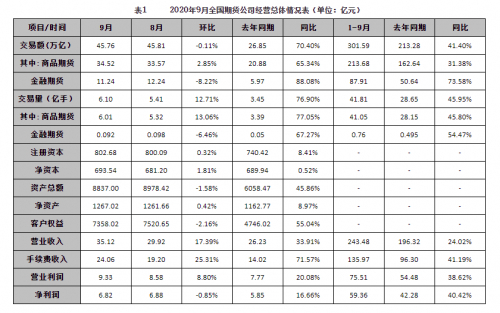 前9月,全国期货公司共计实现交易额301.59万亿元,同比增长41.4%;完成交易量28.65亿手,同比增长45.95%。