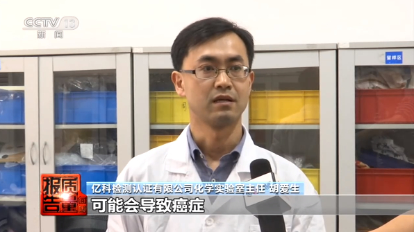 亿科检测认证有限公司化学实验室主任 胡爱生:增塑剂是邻苯二甲酸酯类,这类的增塑剂啊主要是渗出毒性,对儿童的发育有重大影响,如果长期接触到增塑剂的话,可能会导致癌症或者其它一些更严重的疾病。