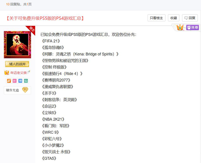 如果你购买了一些PS4游戏的话,放在PS5上运行还能获得升级到PS5版的权益,是免费升级,还是以折扣价购买数字版的形式,具体如何,由游戏的开发商决定。目前可升级的游戏,笔者找到了网友的整理的资料,各位可以看下。