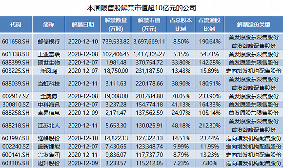 12月10日,上市一年的邮储银行(601658.SH)将面临73.95亿股首发限售股解禁,尽管占总股本的比例只有8.5%,却是解禁前流通盘的1.90倍。以最新收盘价(下同)计算,邮储银行此次解禁市值高达369.77亿元,也是本周A股市场解禁规模最大的公司。