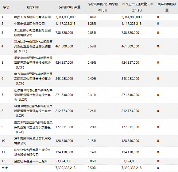 解禁涉及的股东名单中“星光熠熠”,12位股东中包括中国人寿解禁数量33.42亿股,中国电信解禁11.17亿股,还有浙江蚂蚁小微金融服务集团、深圳市腾讯网域计算机网络有限公司,此外还有中央企业贫困地区产业投资基金、社保基金一一三组合、易方达基金、招商基金、南方基金、汇添富基金、华夏基金、嘉实基金等。
