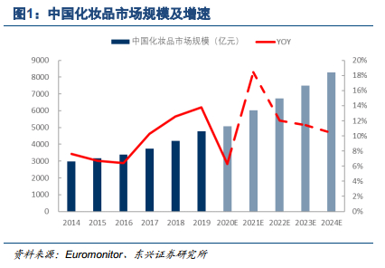从全球市场看,国际香化品牌的高成长也主要来自于亚太市场的推动。据欧睿数据显示,从2014年至今,中国市场复合增速达9.92%(全球市场仅0.76%);2019年欧莱雅集团、雅诗兰黛集团、资生堂亚太市场化妆品消费增速分别达30.41%/20.74%/19%,而对应其全球市场增速仅8%/12.9%/7%。未来5-10年我国美妆行业仍为高成长赛道,市场有望突破万亿规模。