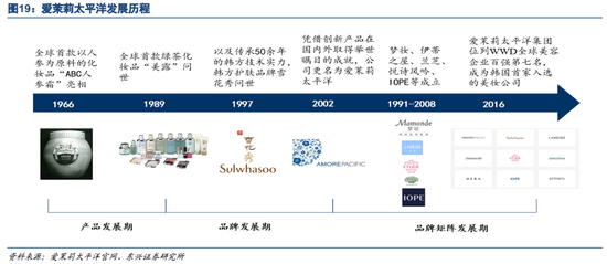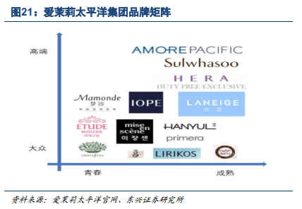·打造植物系护肤品牌,借韩流热度树立品牌形象。集团于1997年,以“ABC人参霜”经典产品为基础,创造出雪花秀品牌;2002年,以绿茶化妆品“美露”植物精华为基础创造出爱茉莉太平洋品牌,主打“养生养颜”的功效型护肤。公司抓住韩流席卷亚洲的机遇,玩转营销手段打造创新爆款,推进产品与品牌的本土化。植入电视剧打造爆款,品牌植入《来自星星的你》《太阳的后裔》等热播影视作品中,提升品牌销量和转化。代言人方面,公司选用与品牌内涵契合的明星形象,高端品牌兰芝选用一线演员宋慧乔、全智贤;以自然植物之美为调性的悦诗风吟则选用天然美女林允儿。韩流热度叠加高流量代言人,树立公司时尚潮流品牌定位,品牌知名度提升。