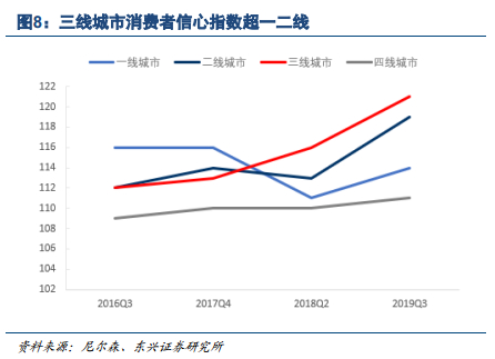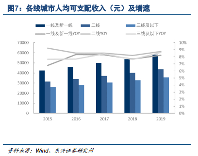但“国产替代”非长期之计。国产品牌需要快速跟随市场热度并推出高性价比产品,面临着成为海外大牌追随者而难以突破超越的发展壁垒。同时,产品总会被首发新产品的光环所掩盖,必须由低价格、高性价比、薄利润等作为代价从而抢夺消费者。此外,电商渠道下沉缩窄了内外资品牌渠道在中低线城市的差距,外资企业可通过中低价位品牌实现降维打击。2019年线上零售渠道增速为16.5%,相比2014至2018年间CAGR35.1%增长明显下滑。同时,一线、新一线城市电商渗透率稳定在80%左右,未来随着下沉市场电商渗透率提升,整体将逐步接近饱和。我们认为,在当前时点下,渠道红利已逐步成为短期驱动因素,中长期看可持续性难以维继。