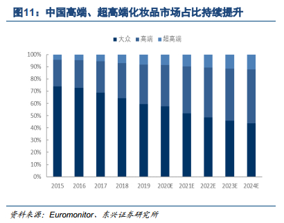国内美妆消费分化加剧,品牌化、精细化美妆市场高位增长。由于城市经济发展程度、社媒渗透率、美妆接受教育度和新媒体渗透时间等差异,导致美妆产品消费者的消费升级处于不同阶段。美妆消费者经历2轮培养后,美妆消费分层更加明显。根据欧睿数据显示,2019年中国大众化妆品、高端、超高端市场份额比重分别为59%、32%、8%;预计到2024年市场份额比重将为43%、44%、12%,高端及超高端美妆高增速下,总占比将超五成。我们认为,虽然国产品牌在品牌化升级上仍为出现明显趋势;但未来国产美妆企业想要赢得更多市场份额,品牌化升级为必然选择。