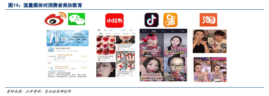 内容分享+短视频等分享平台多元化,持续加深消费者的美妆教育。从2009至今,社媒平台日益多样化,微信、微博、小红书、抖音、快手等分享平台到淘宝等直播平台用户数量持续攀升。KOL高热度点击视频、素人测评,一段分享视频包含护肤、美妆试用效果、功能介绍等多方面。社交媒体的高流量下,将颜值经济辐射范围持续扩大。经过不断美妆种草、拔草,实现对消费者美妆知识普及和颜值教育,影响消费者美妆高消费偏好。加之疫情期间抖音等在线平台流量爆发,用户闲暇时间向线上转移也加深了用户美妆教育。