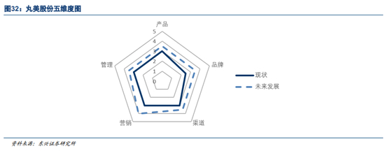 综合国内美妆消费升级与国产品牌发展阶梯,我们建立了围绕产品、渠道、营销、品牌、管理的五维度评价体系,并测评其当下以及未来的各项指标变化。