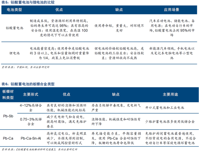 铅锑系合金电池和铅钙系合金电池各有利弊。铅锑系合金主要仍用于汽车、摩托车、灯具等少维护铅酸蓄电池中,具有循环使用寿命长、硬度高和性能好等特点,但锑易加大电池的自放电现象造成减液;而铅钙系则主要用于免维护铅酸蓄电池中。在美国等发达国家,铅钙合金普遍应用于免维护的封闭式铅酸蓄电池中,但铅钙合金的循环寿命差,易发生早期容量损失,制造过程中需要加入一定量的锡和铝。