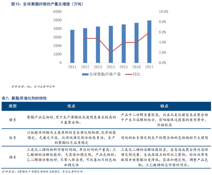 无论采取哪种路线,含锑化合物的催化剂均是核心生产要素。聚酯纤维的生产方式分苯二甲酸二甲酯(DMT)和对苯二甲酸(PTA)两种路线,其中中国引进的多套聚酯装置所用催化剂均为锑系化合物(分别为三氧化二锑和醋酸锑),而法国推出的乙二醇锑催化剂作为传统催化剂的升级产品也被广泛使用。
