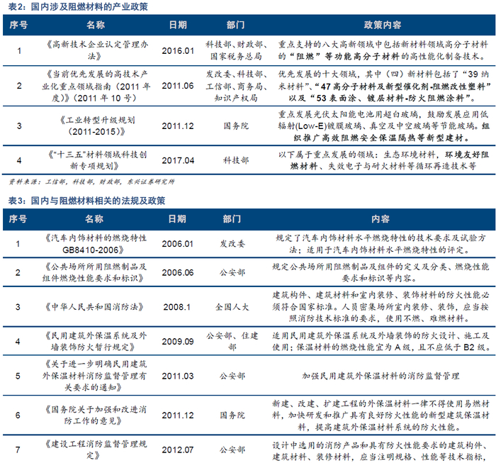 至2020年,中国已出台《公共场所用阻燃制品燃烧性能要求和标识》、《建筑材料燃烧性能分级方法》、《高层民用建筑设计防火标准》等阻燃方面的法律法规。
