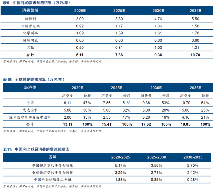 “十四五”期间中国锑金属消费量的年复合增速有望维持在5%左右。从人均锑消费量看,目前中国每亿人口平均消费金属锑仅0.5万吨,美国的每亿人口平均金属锑的消费量稳态值为0.85万吨。考虑到中国阻燃剂领域锑金属的消费量还有较大的增长空间,能源合金领域仍将受益于相关产业规模的扩张,预计中国锑的消费总量将趋势性上升。根据我们的推算,至2025年、2030年和2035年中国的锑消费量将分别达到7.86万吨、9.36万吨和10.7万吨,期间年复合增速分别为5.2%、3.6%和2.7%,全球的锑消费量分别达到15.41万吨、17.62万吨和19.85万吨,至2035年我国占全球锑消费的比重将升至54%。