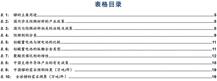 锑的消费结构显现多元,但主要应用集中于阻燃剂、铅酸蓄电池和化工领域。锑的消费形式主要包括锑金属和锑化合物两种。锑金属主要用于制造合金,通常用以铅酸蓄电池生产(50%启动电池/40%动力电池);高纯度锑金属用于生产半导体及军工产品。锑化合物中氧化锑是锑消费的主要产品,全球近90%的氧化锑应用于阻燃剂。目前在阻燃剂、铅酸蓄电池领域的锑消费量占全球总需求的80%以上,其中阻燃剂领域占56%,铅酸蓄电池领域占29%,此外化工领域占10%。
