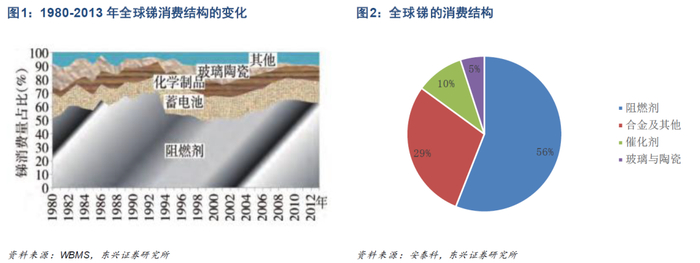 随着全球的科技进步和经济发展,锑的应用领域转向阻燃及能源合金领域。近30年间锑的消费结构发生了重大变化:锑金属的消费量下降,同时锑化合物的消费量上升。据安泰科数据,全球范围内锑在阻燃剂和铅酸蓄电池等合金领域的消费量占锑总消费量的80%以上,其中阻燃剂领域占56%,铅酸蓄电池领域占29%。催化剂和玻璃澄清剂是锑的其他重要消费领域。
