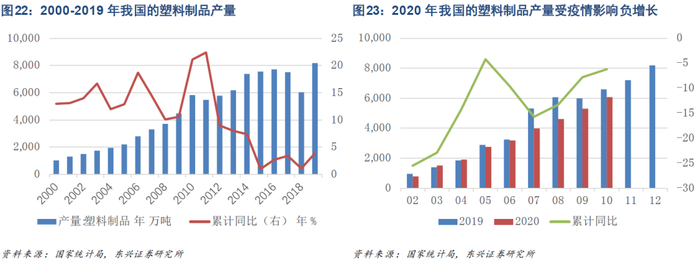 假设1:近年来我国的塑料制品增速放缓至5%以下,2020年受到疫情的显著影响,M1-M10塑料制品产量同比下降6.2%,预计全年中国的塑料制品产量或同比下降5%。考虑到塑料行业订单及库存周期的变化,2021年塑料产量有望迎来报复式增长,“十四五”期间塑料产量有望保持3%左右的复合增长。