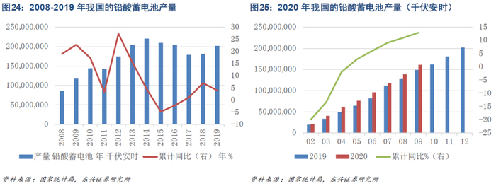 铅酸蓄电池产量有望受益于电动自行车及新能源产业的发展。2012年后中国的电动自行车行业长期保持10%左右的增长,2020年前三季度中国电动车行业产量累计同比增长30.3%,有效提振了铅酸蓄电池的产出规模。此外,根据国家能源局《电力发展“十三五”规划》,要求到2020年太阳能发电装机达到1.05亿KW,风电装机容量达到2.1亿KW。“十四五”期间太阳能及风力发电产业将保持高速发展,该领域铅酸蓄电池需求量也将高速增长。