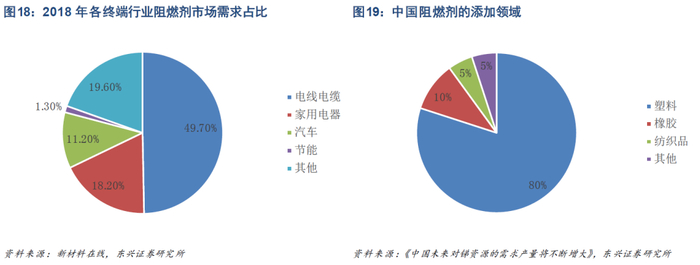 阻燃剂在中国主要用于电线电缆、家电及汽车等行业的塑料制品中。2013年中国的阻燃剂应用中塑料占80%,橡胶占10%,纺织品占5%,其他占5%。根据新材料在线的数据,2018年中国电线电缆、家用电器和汽车对阻燃剂的需求量分别为38万吨、13.9万吨和8.6万吨,分别占阻燃剂总消费量49.7%、18.2%和11.2%。