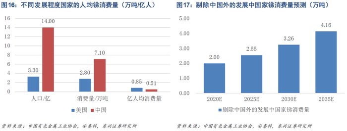 全球锑的消费重心向发展中国家转移,新兴经济体的锑消费增长潜力大。全球的锑消费量约13万吨,主要集中在中国(47%)、美国(21.5%)等经济体。发达国家的年度锑消费稳定在5万吨左右,新兴市场的阻燃立法普及、汽车及电动自行车与聚酯工业的市场规模扩张拉动锑消费持续增长,并成为锑的主要增量市场。我们预计2025年、2030年和2035年除中国外发展中国家的锑消费量将分别达到2.55万吨、3.26万吨和4.16万吨,占全球消费比重由15%升至21%。