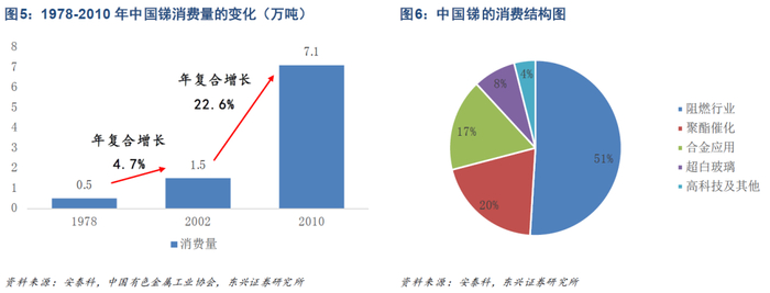 锑的应用可追溯至公元前,应用范围广泛,曾作为化妆品、装饰品、药物、合金及阻燃制品等使用。在公元前3100年的埃及前王朝时代,三硫化二锑已被当作化妆的眼影粉使用;至17世纪锑被科学界认知,而中国则在1541年发现了世界最大的锑矿,但彼时锑的应用领域不是很广泛。直到第一次世界大战期间,锑合金以其优良的性能在军工行业使用,自此金属锑的需求开始急剧增加;而近代铅酸蓄电池的出现,对锑的消费起了进一步的带动作用。此外,20世纪30年代,氧化锑和卤系阻燃剂的协同阻燃效应被人们发现,锑系阻燃剂逐渐成为锑最重要的应用领域。伴随着每次结构性迭代,锑的消费量都呈现出不同的变化特征: