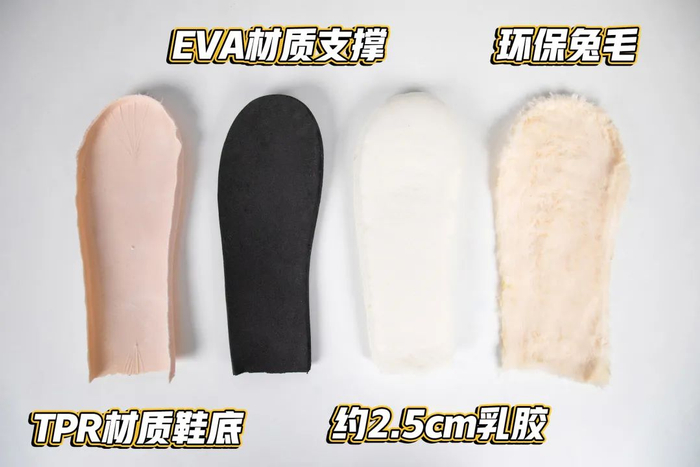 货真价实的4层大底才能做出一双拖鞋,仿真兔毛保暖层+泰国进口乳胶填充层+EVA支撑层+TPR防滑鞋底。