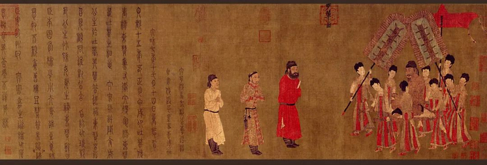 唐代阎立本绘《步辇图》描绘了唐太宗接见吐蕃使者禄东赞的情景