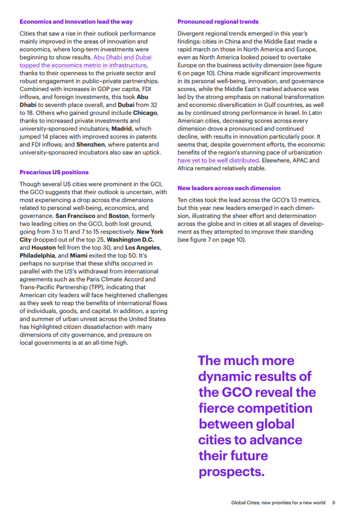 潜力城市排名的上升都得益于其在治理和经济发展方面的长期投入,特别是中国和中东城市,它们正在快速追赶欧洲和北美城市。