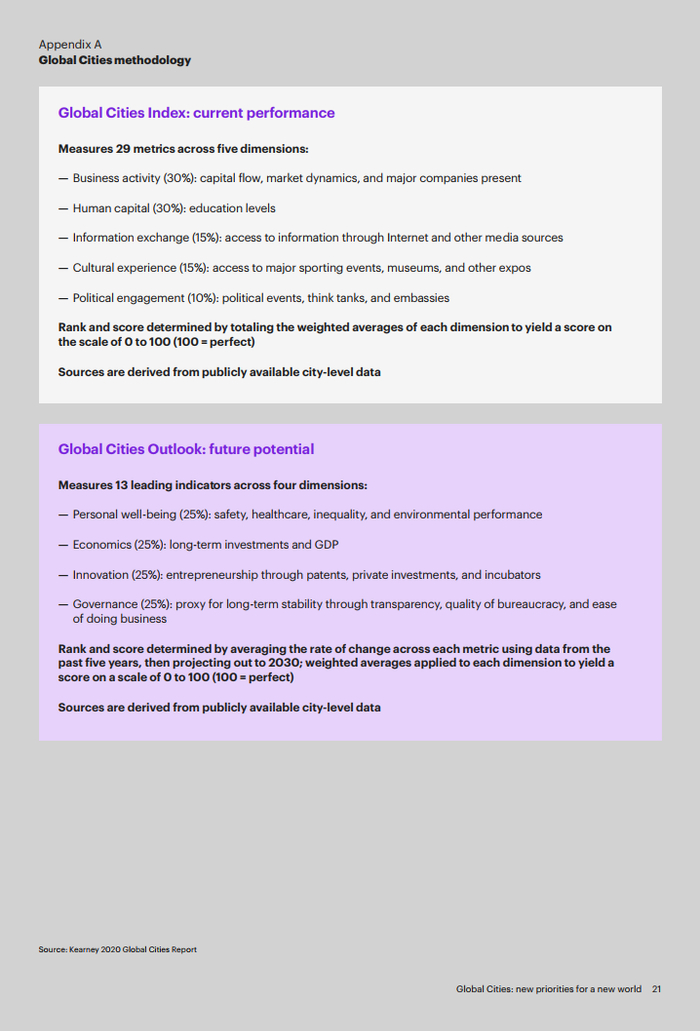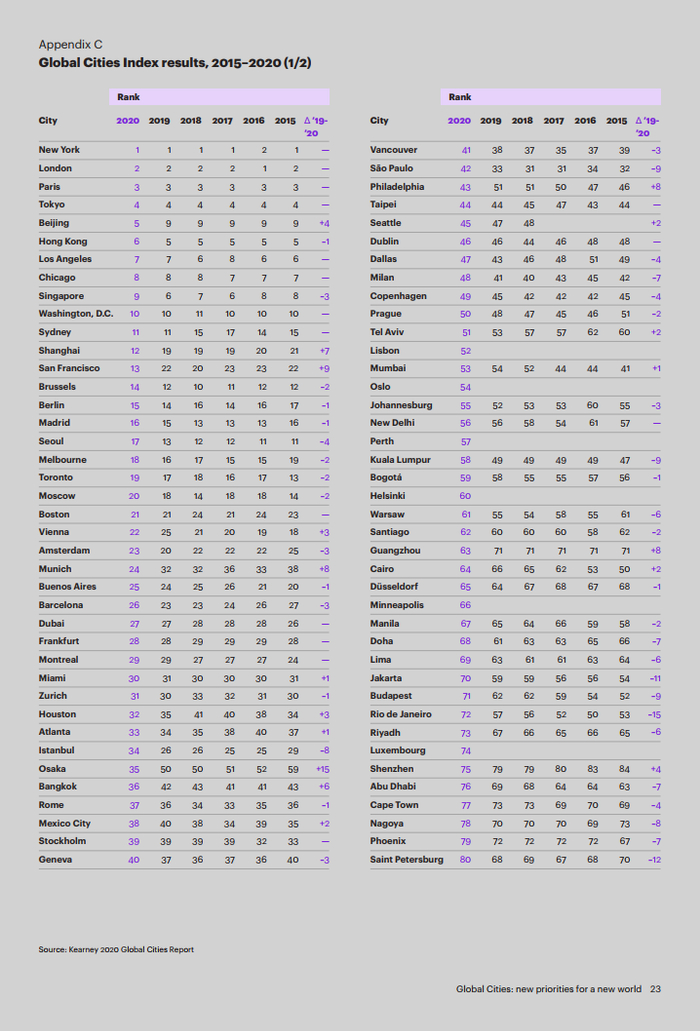 科尔尼《全球城市综合排名》(GCI)基于贯穿五个维度(商业活动、人力资本、信息交流、文化体验、政治事务)的29个指标对城市的现状进行了排名。该指数对全球各大城市的影响力、表现以及发展水平进行了深入分析并提供了独到见解。它也为多个不同城市之间的核心竞争力和差异化优势提供了比较。