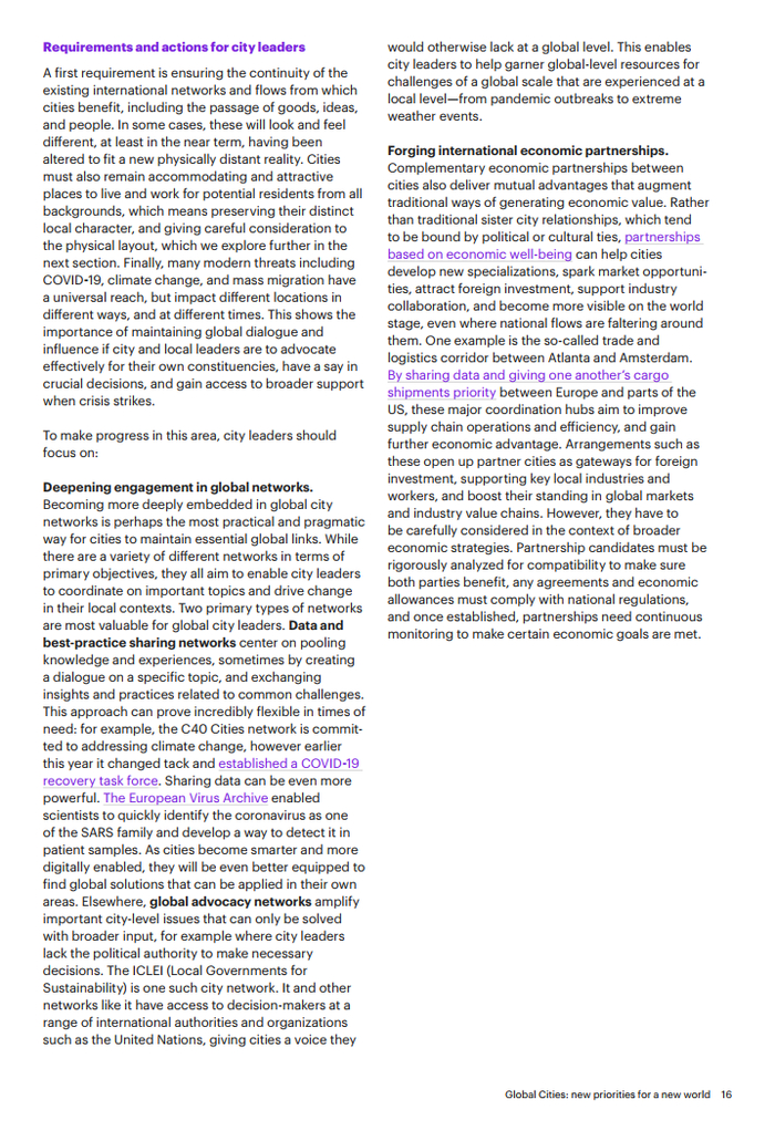 其次,加强城市互联互通。国际商品流通、思想交流、人员流动和资金融通对城市发展至关重要,但这些要素的流动现在受到疫情短期影响和国际秩序逆全球化长期趋势的双重威胁。面临日益严峻的国际形势,城市领导者需竭力恢复和扩大与全球其他城市的联系,维持关键要素的流动。
