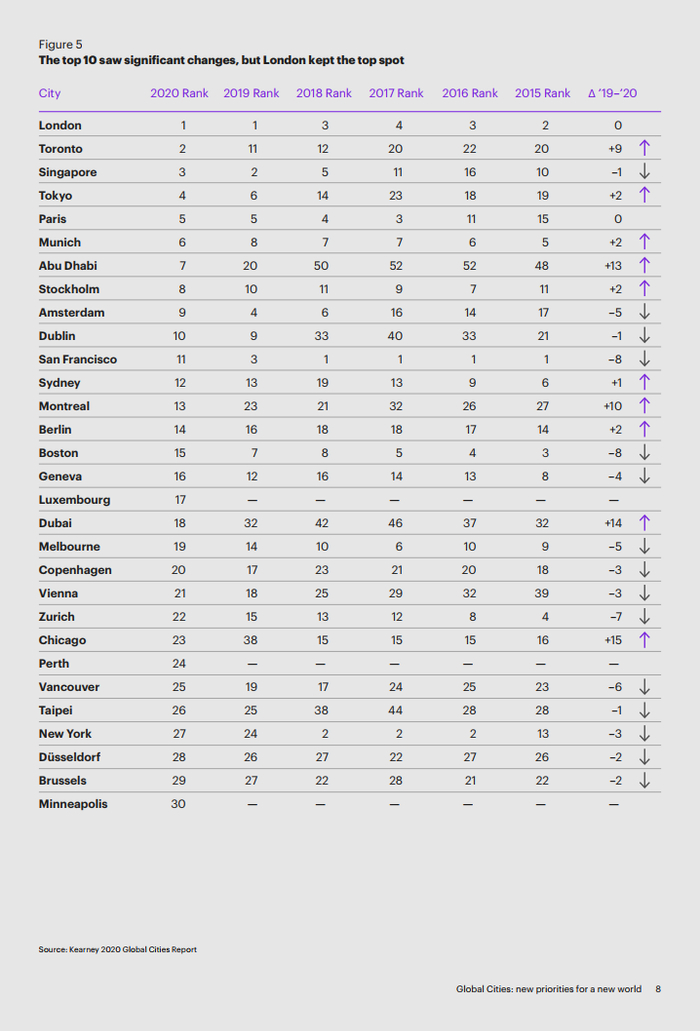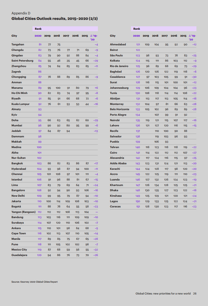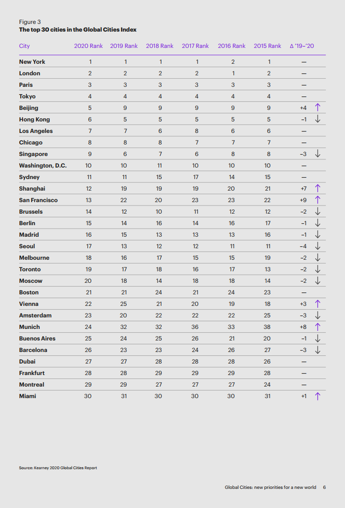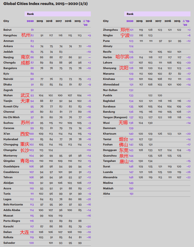 科尔尼发布2020年最新全球城市综合排名:中国一线城市、新一线城市排名普遍上升