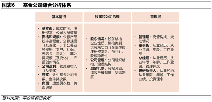 以规模和业绩来评判基金公司比较清晰和直观,但是不够全面和准确。比如有些基金公司总体规模较小,但是在某些品种上具有优势;有些总体规模大的基金公司,分类产品业绩相对不理想。规模和业绩更多的是体现了结果,综合剖析一个基金公司需要一个完整的体系。