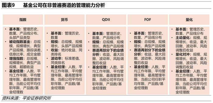 除了主动权益和主动固收两个核心类型外,指数型、货币型也是重要的产品方向,QDII、FOF和量化基金在部分基金公司中也有一定的规模。有些基金公司在某些类型上也有一定的专长。由于这五个类型的产品特性不一致,因此具有不同模式的量化分析体系。