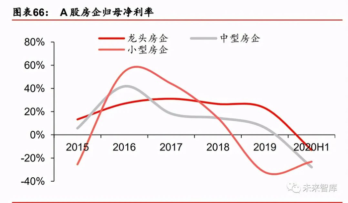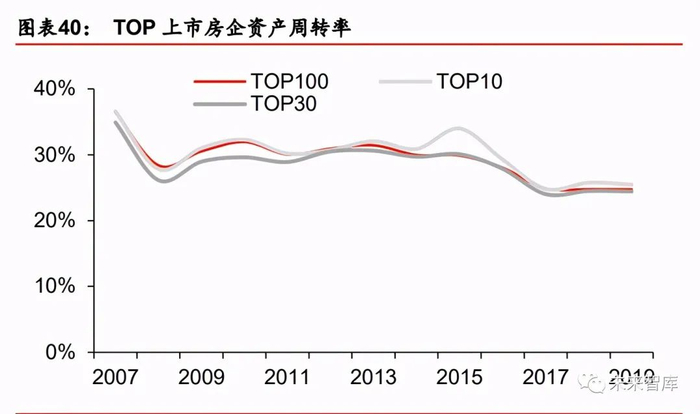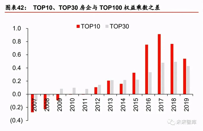 从趋势上来看,2011 年起行业归母净利率以及资产周转率整体均处于下行通道,支撑 ROE 维持区域内震荡的因子只有持续提升的权益乘数。分房企梯队来看,较之归母净利率以及 资产周转率,权益乘数的分化表现更为明显。2016 年以前,TOP10 房企较之 TOP30、 TOP100 房企的归母净利率以及资产周转率具备一定优势,但自 2016 年以来两方面因子 趋于同化。而权益乘数的趋势则完全相反,自 2015 年以来,权益乘数开始分化,2017 年 TOP100 房企与 TOP10 房企的权益乘数的差距由 2014 年的 14pct 提升至 91pct,2019 年 TOP10 房企相对 TOP100 房企的权益乘数优势依然有 54pct。