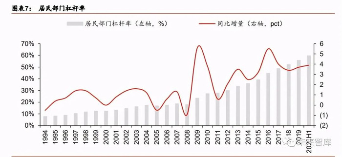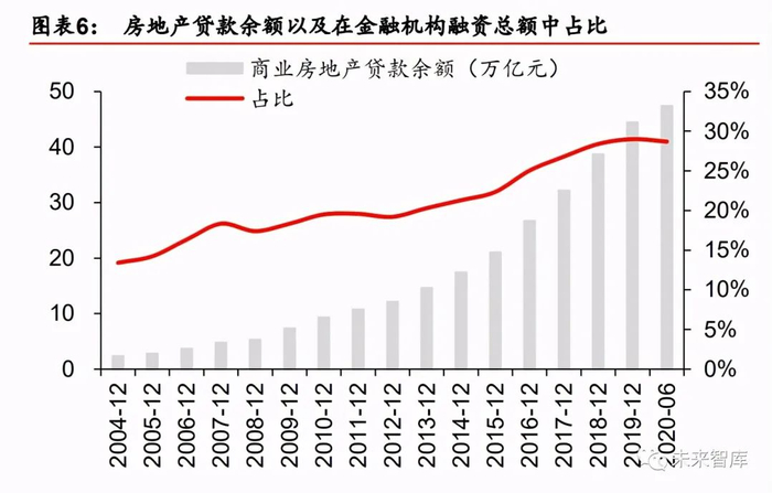 也正是因为这种持续的“正向反馈”,带来了房地产行业的“镀金”之旅。过去十几年我 国房地产相关融资规模不断扩张,占比不断提高。截止 2020 年 6 月底,商业房地产贷款 余额达 47.4 万亿,2005 年以来年复合增速达 21.3%,扣除按揭贷款后,年复合增速仍达 20.9%。整体商业房地产贷款占金融机构各项贷款余额的占比持续提升,自 2004 年的 13% 增至 2019 年的峰值 29%;同期按揭贷款余额的年复合增速为 21.4%,伴随持续释放的居 民贷款增长,居民杠杆率也不断提升,截止 2020 年 6 月 30 日,居民杠杆率由 2009 年的 23.5%提升至 59.7%,过去 10 年平均每年增长 3.4 个百分点。如果再算上影子银行等, 房地产相关融资占比预计更高。