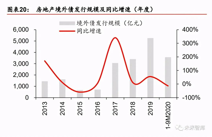 2016 年以及以前境外债发行规模较低,2017 年开始爆发式增长,我们认为主要是由于 2016 年四季度开始,境内融资收紧而导致具备海外融资渠道的房企开始重视这一融资手 段。17-19 年境外债发行规模持续扩张,从 2016 年的 689 亿增至 19 年的 5253 亿,年复 合增速达 97%。但 2020 年来有所下降。疫情为房地产境外债发行按下“暂停键”,5 月以 来逐步恢复。2020 年 1-9 月房地产境外债发行规模 3545 亿元,同比下降 13%,去年以 来境外债也逐步进入“借新还旧”监管。
