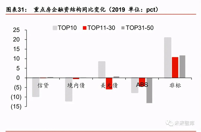 从房企融资渠道的结构来看,主要还是以银行信贷和公司债券为主,在融资收紧环境下, TOP10、TOP11-30 以及 TOP31-50 各梯队房企的信贷、境内债、ABS 融资占比均有所下 降,海外债方面大企业融资力度加大,非标渠道占比有所提升。