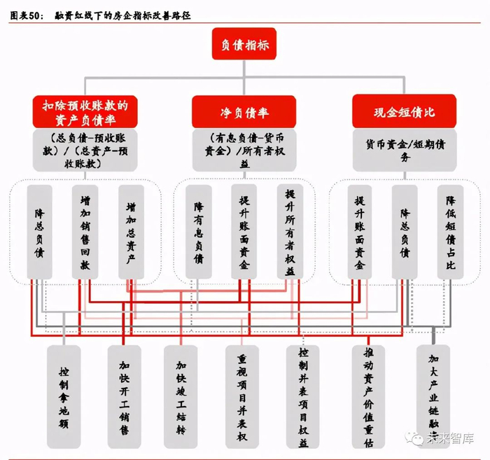 融资新机制设下的三条红线分别为:指标 1——扣除预收账款的资产负债率、指标 2—— 净负债率以及指标 3——现金短债比。“三条红线”将考核标准量化,站在企业的角度,运 营层面的应对预计也将围绕改善这三项指标展开。