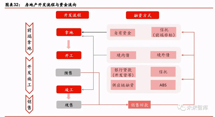 1、前端拿地环节中,有息负债中主要是信托融资中的部分非标产品可供支持;2、拿地后 至开发施工环节中,银行贷款、ABS、非标、供应链融资均可参与。房企获取的土地四证 齐全,即可获取开发贷,土地符合 “432”要求,即可发行房地产信托;3、供应链融资 则主要发生在开发环节,用于支付工程款。境内债、境外债在 2016 年以前可用于地产开 发全周期,但是 2016 年以来监管层对其使用范围逐步收窄,一般不允许用于拿地。