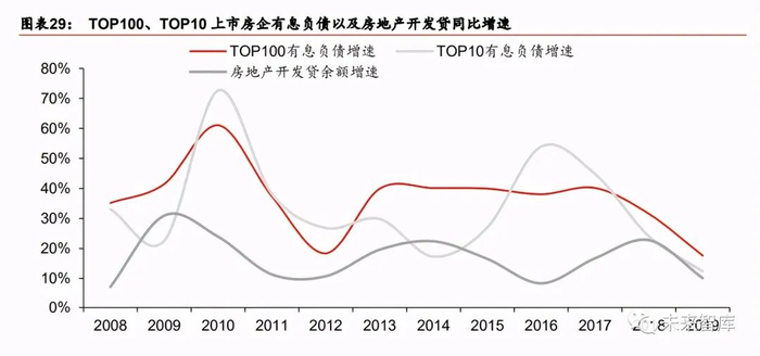从我们整理的 TOP10 和 TOP30 房企的数据来看,整体呈现“拿地额”领先“有息负债” 领先“销售额”的顺序,滞后的周期大概在半年到一年之间,过去 6 年房企拿地与有息负 债的扩张周期均为 2015-2016 年,销售额则在 2016-2017 年出现大幅增长(TOP30 房企 16、17 年销售额加权平均增速分别高达 56%和 52%),而后两者的增速都在近年出现回 落,这也符合房地产流程的自然周期,整体而言,有息负债的弹性直接决定了房企销售规 模的弹性。