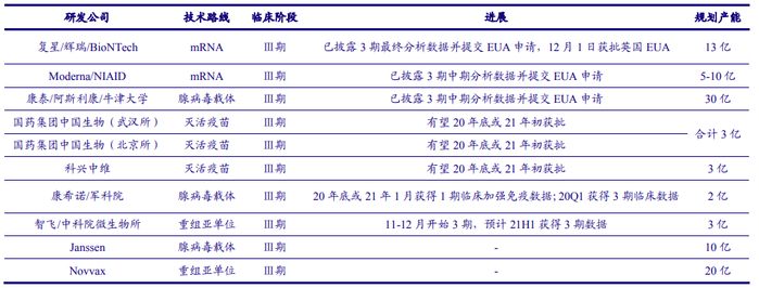 我国主导或参与的处于临床Ⅲ期的品种共有 7 个,其中,中生制药武汉所和北京所的两个灭活疫苗,科兴中维的灭活疫苗预计有望20 年底或 21 年初获得 CFDA 批准上市;康希诺/军科院的腺病毒载体疫苗预计 21Q1 获得Ⅲ期临床数据;智飞/中科院的重组蛋白亚单位疫苗预计 21H1 获得Ⅲ期临床数据。